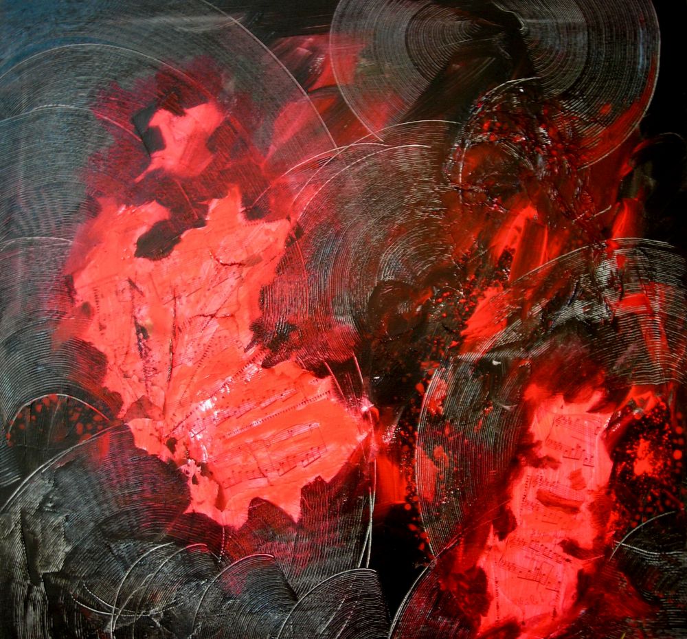 Peinture abstraite sur la musique avec collage de partition et interprétation toute personnelle de la couleur rouge et noire