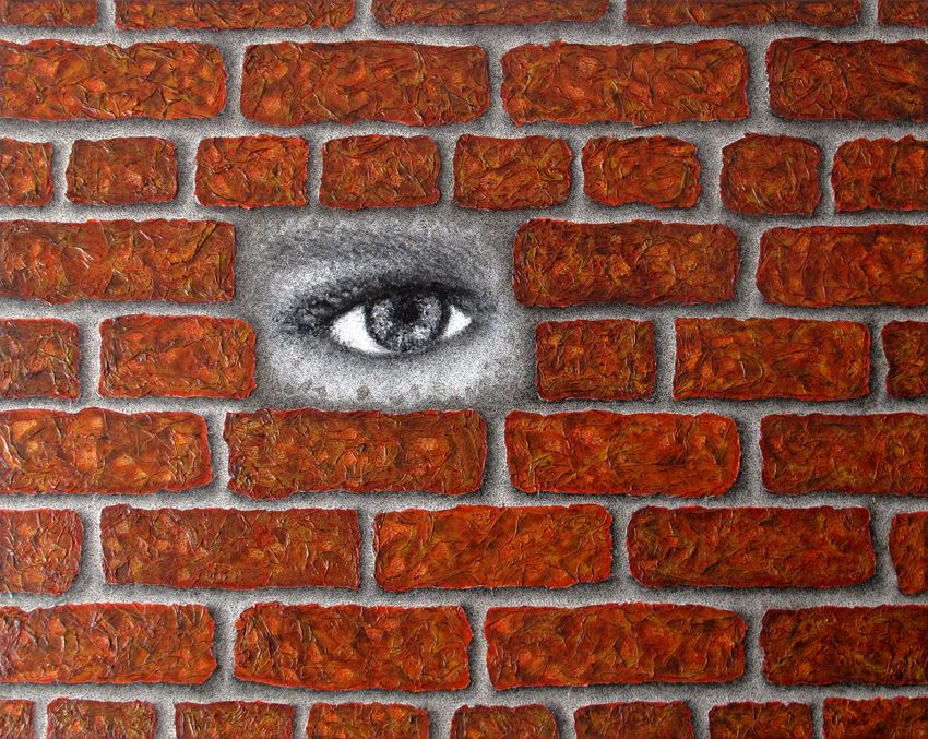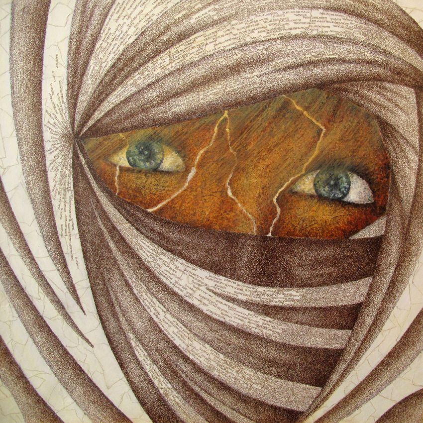 Papiers blancs déchirés recollés sur toile. Choix de mots écrits à outrance sur ce patchwork de matières : tabous, on-dits, non-dits, peur des mots, mots de trop, trop de maux, plus de mots… jetés ça et là, épars ou collés, juxtaposés, à l’endroit, à l’envers, superposés jusqu’à l’excès, les mots sculptent le tableau… les reliefs se forment, ombres & lumières apparaissent, le tableau prend corps. Cette dentelle de mots opère comme un bâillon, elle enserre, étouffe, écrase la pensée avant d’étouffer la parole. On finit muselée par tous ces mots qu’on n’a pas pu dire. Reste le regard comme ultime moyen d’expression… Regard peint à l'acrylique.