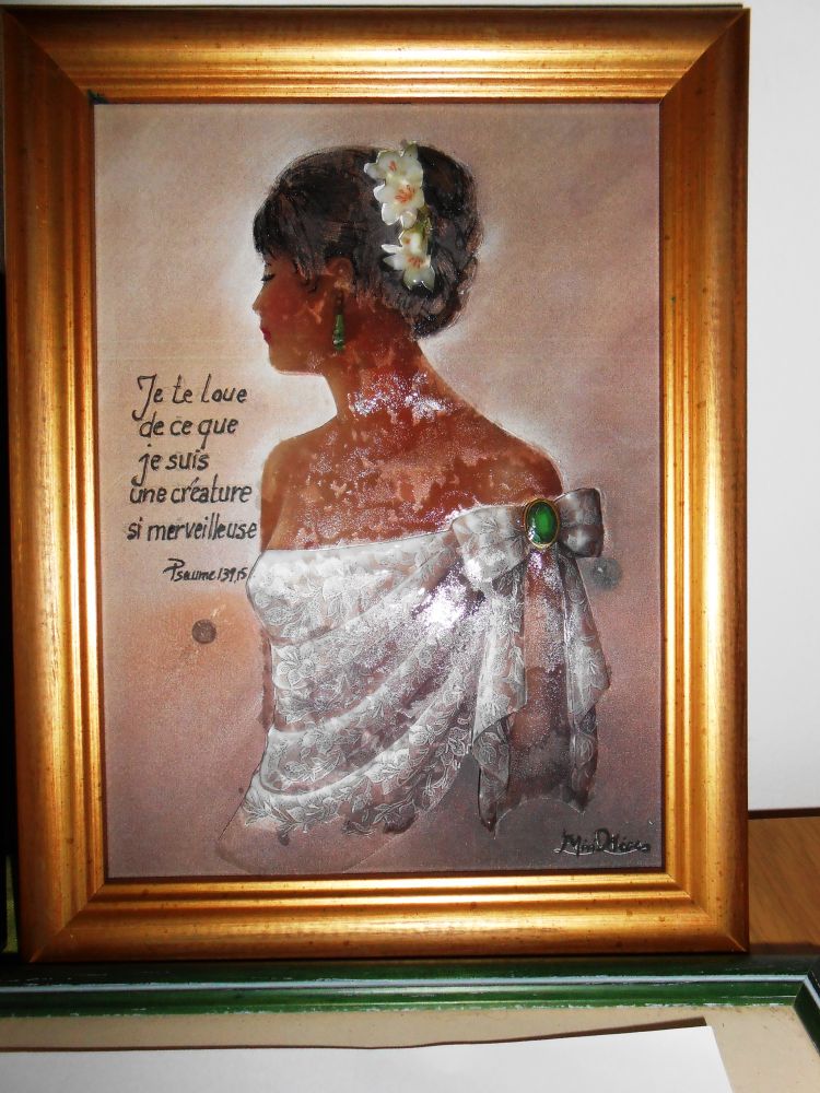 Jeune congolaise vivant en Belgique, j'ai toujours aimé le dessin, la déco en général. Je n'ai pas eu l'occasion de perfectionner mon don qui me rattrape quand même, je m'essaie avec la création de tableaux décoratifs et des cartes avec des images 3D. J'ai une page Facebook "Mimi's Délices" et je cherche à cumuler avec la peinture et faire vivre mon art.