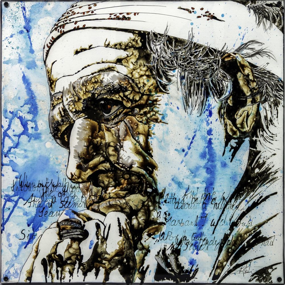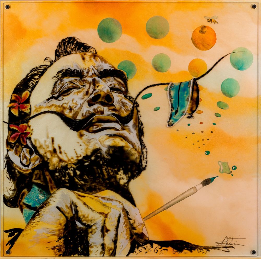 Dali peint avec des encres acryliques sur plexiglas. Le fond est travaillé à la peinture à l'huile sur bois |