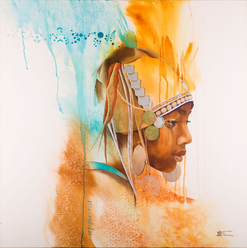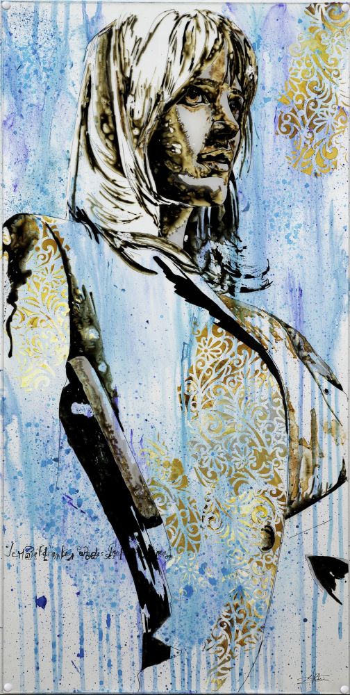 Femme de trois quart assise peint avec des encres acryliques sur plexiglas. Fond réalisé à l'acrylique sur bois |