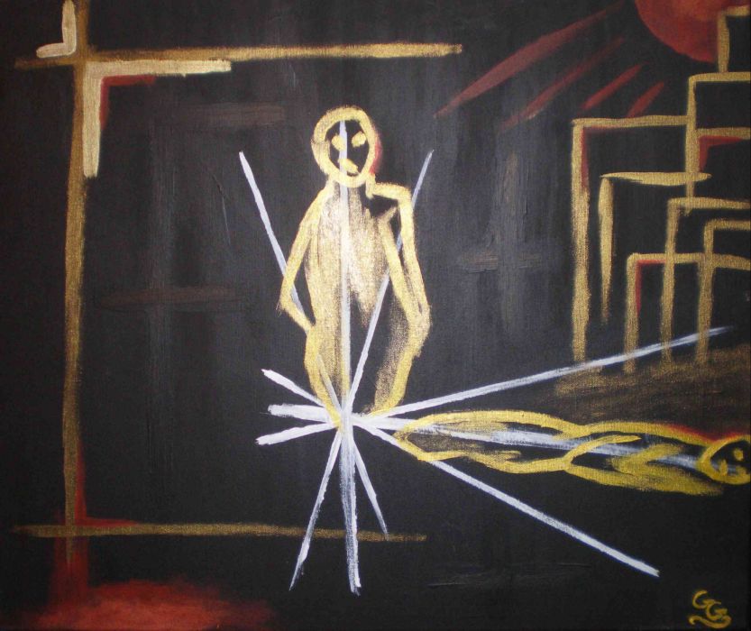 Acrylique ,mortier sablé,tissu et dorure sur toile.Fin tragique d'un homme désespéré. |