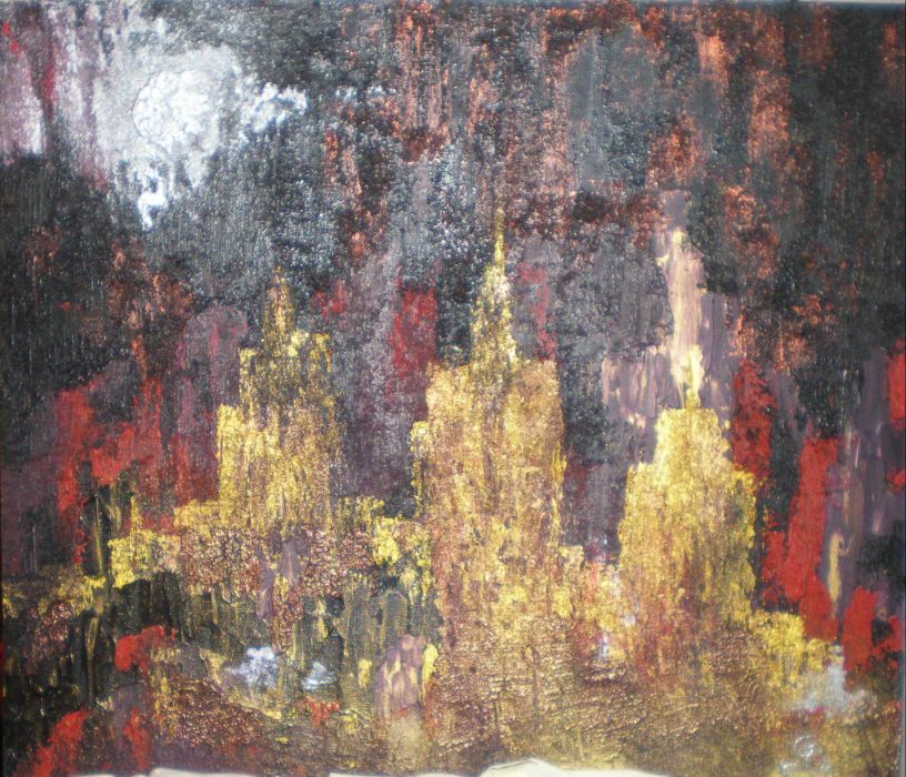 Peinture acrylique sablée plus medium effet craquelé sur bois.Une metropole mysterieuse et majestueuse par une nuit de pleine lune. |