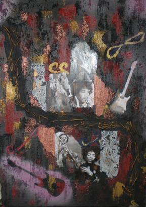 Acrylique, mortier sablé et impressions papier collées sur toile.Hommage au grand musicien,génie de la guitare. |