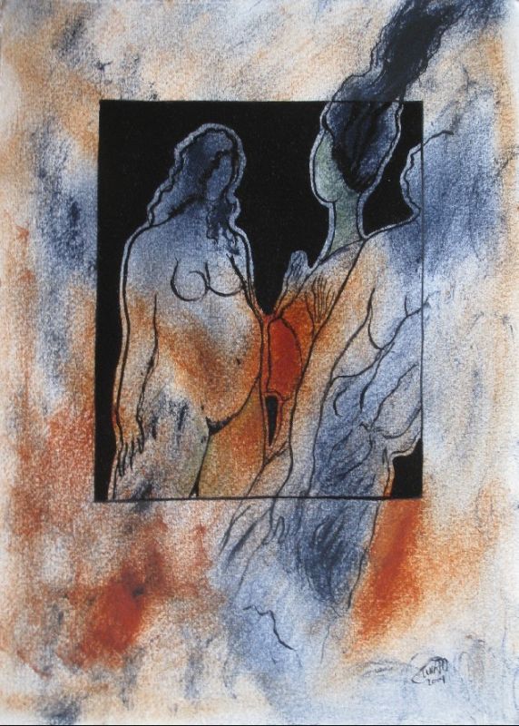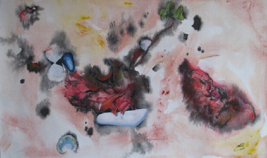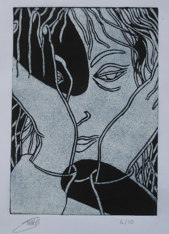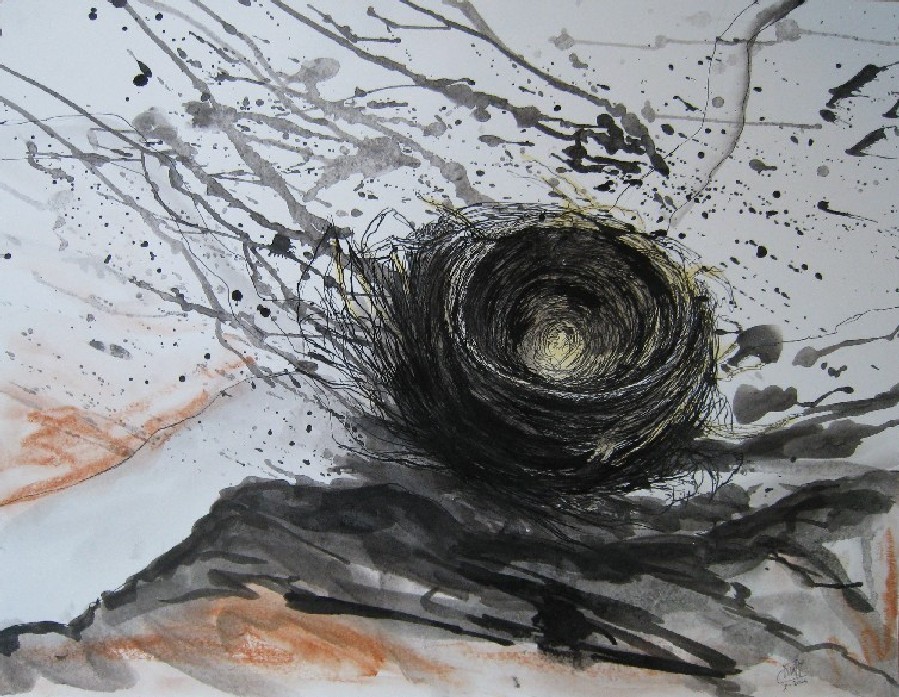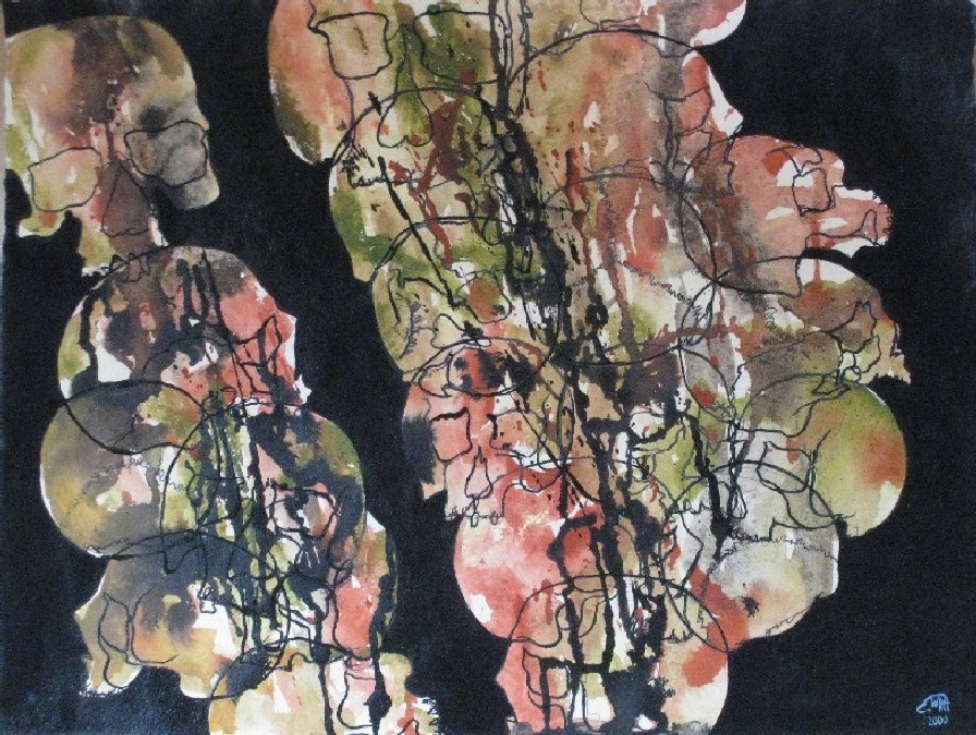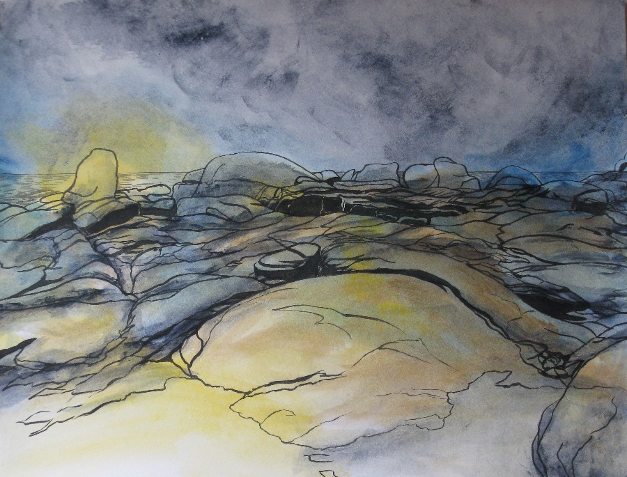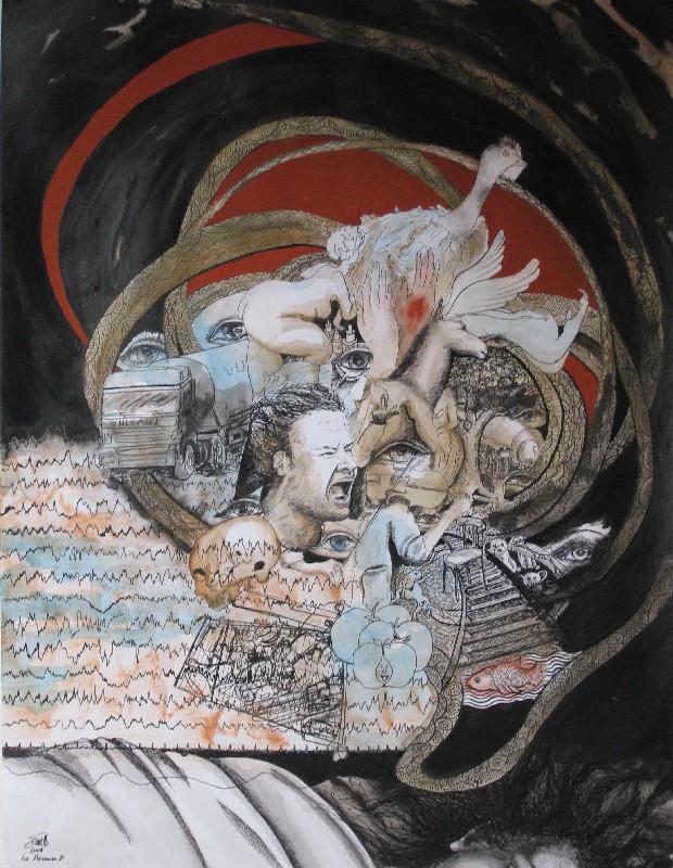 Mon travail s'articule autour de thèmes travaillés en séries , l'encre étant une sorte de fil conducteur -que ce soit encre taille douce en gravure ou encre de Chine en dessin et en peinture, peinture et gravure allant de pair. Dans le cas de la peinture l'encre est associée à l'aquarelle, le pastel ou l'acrylique.