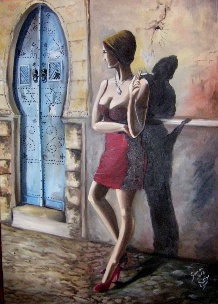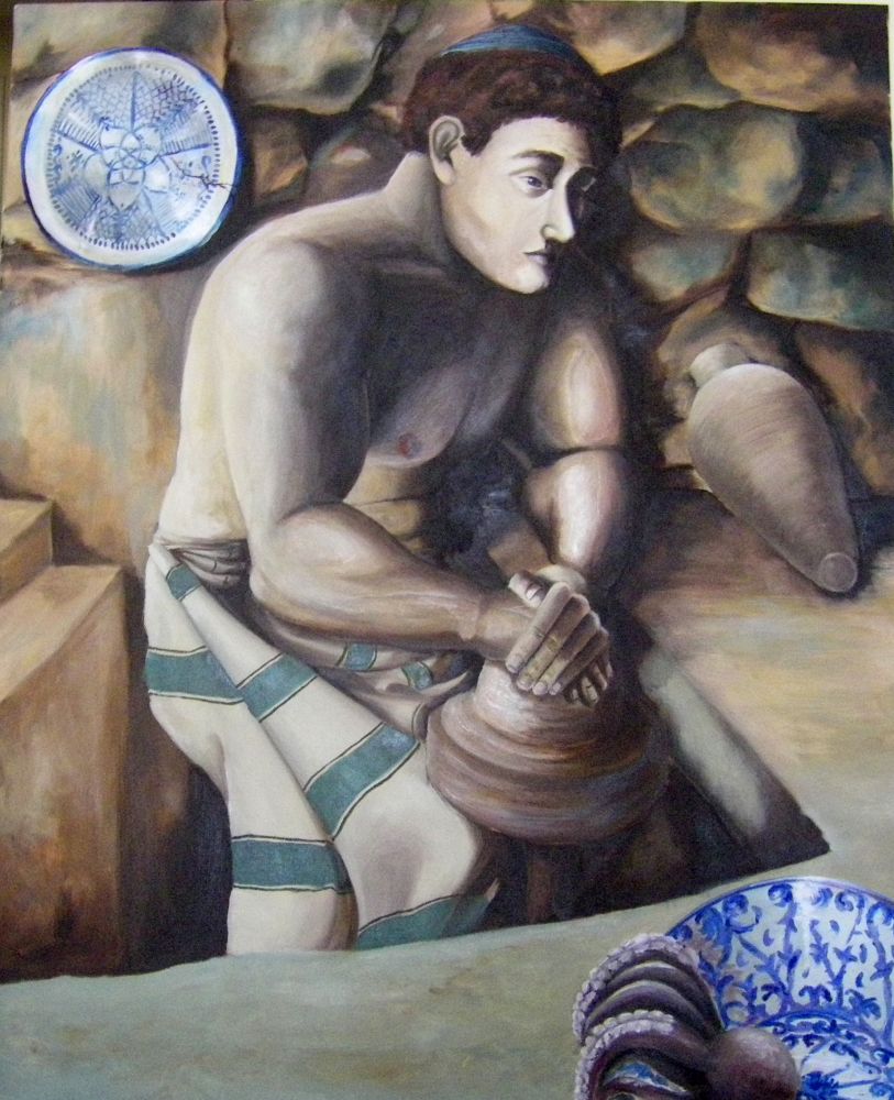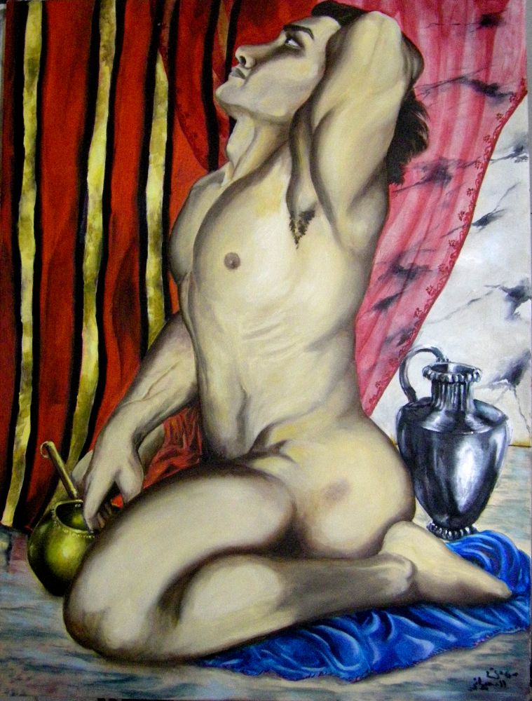 huile sur toile de lin, ayant comme thème le nu masculin sous une vision orientaliste. Cette peinture représente un potier en référence à la région de karkannah, où l'on vit modestement avec une légère touche d'érotisme et un clin de mélancolie...Le potier propose ses jarres en terre cuite aux pécheurs de la région, en contre partie une part du panier : le poulpe, spécifique à kerkannah |