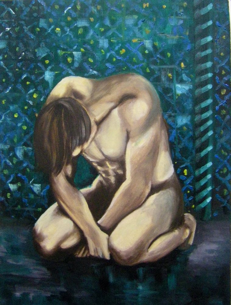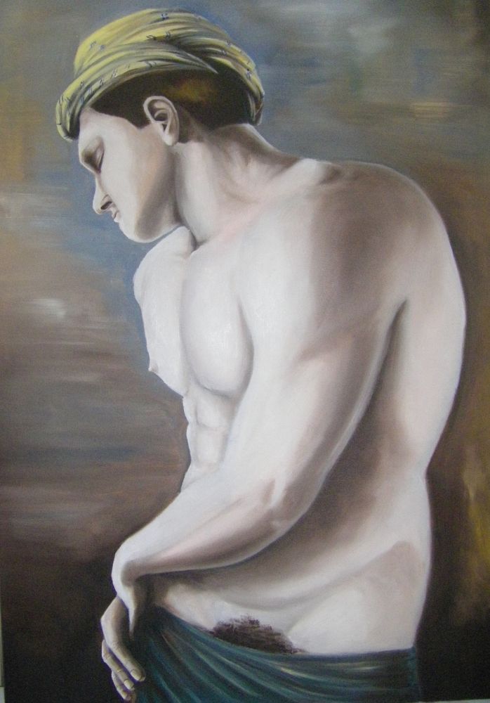 Un nu masculin dans un espace orné, avec un seau doré, en référence des hammams traditionnels tunisiens, à travers ce thème : le hammam, j'ai essayé de travailler sur le nu masculin qui incarne une certaine rigidité pour la contraster par l'ambiance assez féminine du lieu. |
