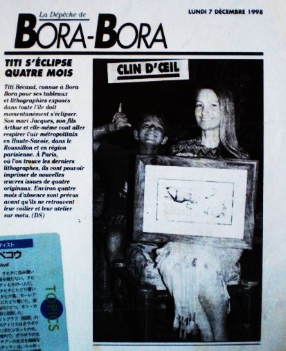 Art pratiquéPeinture, Aquarelle, DessinSite de l'artistehttp://watankasantika@hotmail.frPrésentation de l'artisteTiti Bécaud naquit le 13 février 1950 dans le quatorzième arrondissement de Paris . Elle débuta professionnellement en 1973, à la Treille, dans son atelier de Gassin dans la presqu’île de Saint Tropez .Suivirent de nombreuses expositions à l’atelier 21 de Saint Tropez, au Salon International de Printemps de la ville de Marseille, à la galerie Azuréenne d’Antibes, à la galerie Pro Arte de Lausanne (Suisse) ... En 1982, après deux années passées à construire son voilier à Miami (Floride), elle prit la mer pour un long voyage de quinze ans, ponctuées de nombreuses escales créatrices : Exposition à Coconut Groove (Miami). Exposition à Nassau (Iles Bahamas) . Exposition à Saint Thomas (Iles Vierges Américaines) . Exposition à Saint Barthélémy (Antilles) . Exposition à Port Of Spain (Trinidad Antilles) . Exposition à Newport (Rhodes Island-USA) . Exposition à Puerto Vallarta (Mexique) . Exposition à la Jolla (Californie USA) . Elle jeta l’ancre en 1990 dans le lagon de Bora Bora (Polynésie Française), où elle installa son atelier sur le motu Piti Aau . De 1990 à 2007 : Edition de 36 lithographies numérotées à 200 exemplaires et création de nombreuses aquarelles et acryliques sur toile, et : Exposition permanente à la galerie Bora Bora d’Alain et Linda . Exposition permanente à la galerie Matira Beach de Bora Bora . 1993 : Commande de carte de vœux pour l’hôtel Bora Bora . 1994/1995 Divers travaux graphiques pour des sociétés de Papeete (Tahiti) . 1996 : Achat par la Poste de Polynésie française (OPT) d’une toile intitulée « Vahiné » pour l’émission d’un timbre pour la Journée de la Femme . 1997 : Exposition permanente à la galerie Van Nuffelen de Papeete (Tahiti) . 1998 : Achat d’une aquarelle intitulée « Maru » par l’OPT pour l’émission d’un aérogramme-air-letter. Carte de vœux pour l’hôtel Intercontinental TE MOANA . 2004 : Achat d’un acrylique sur toile intitulé « Troca » par l’OPT, sur le thème de la Femme en Polynésie . 2006 : Exposition permanente dans la galerie Antipodes de Papeete (Tahiti) . 2007 : Création (textes et peintures) d’un livre pour enfants intitulé « Un autre jour à Bora Bora », réalisé en aquarelles et encre de Chine, paru aux Editions Le Motu (Papeete/Tahiti) en version française et anglaise . Rencontre avec Pierre, psychologue et sociologue au Service des causes humanitaires, qu’elle épousa le 30 juin 2007 à Bora Bora, et avec qui elle travailla pour réaliser sa dernière exposition caritative tahitienne : Exposition à l’hôtel Bora Bora NUI où, pour remercier le peuple tahitien de son hospitalité chaleureuse, elle fit don des bénéfices des ventes, comme du reste de ses toiles exposées dans les galeries de l’île à l’association Vahiné ORAMA qui s’occupe des enfants maltraités et des femmes battues, qui créa au sein même de l’association, la Fondation Titi Bécaud . 2008 : Elle partit deux mois avec son époux sur les sentiers du Chemin de Saint Jacques de Compostelle, de Perpignan à Fisterra, où elle trouva l’inspiration pour la réalisation de son deuxième livre pour enfant en cours de création.. 2009 : Réalisation de 19 aquarelles originales, et préparation d’une exposition caritative des originaux de lithographies réalisées de 1991 à 1997 . Sa peinture où elle travaille la transparence avec des jus de sa création est le reflet même de sa nature profondément humaniste et altruiste, comme elle exprime sur la toile l'existence quotidienne des êtres, ainsi que la douceur de cette beauté qui nous manque tant en ce monde. Expo actuelle